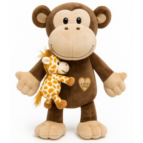 Deze vrolijke aap is niet alleen superzacht, maar heeft ook een beste vriendje bij zich: een mini giraffe! Samen vormen ze een onweerstaanbaar duo dat klaarstaat voor uren knuffelplezier.